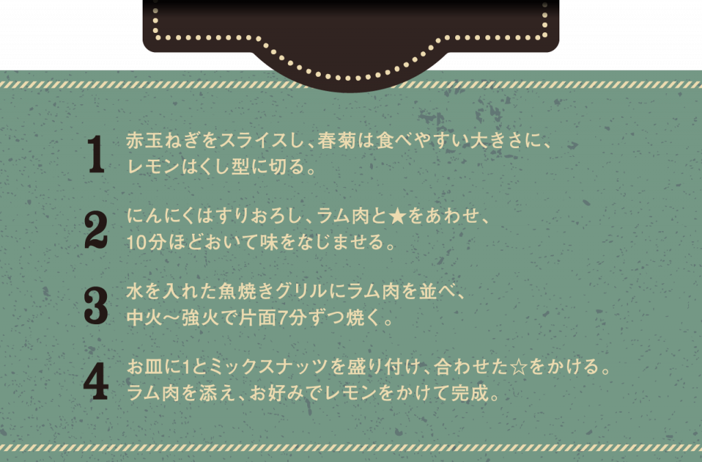 ●春菊とレモンの香りで、ラムのくさみをおさえているので、苦手な方にもオススメです。