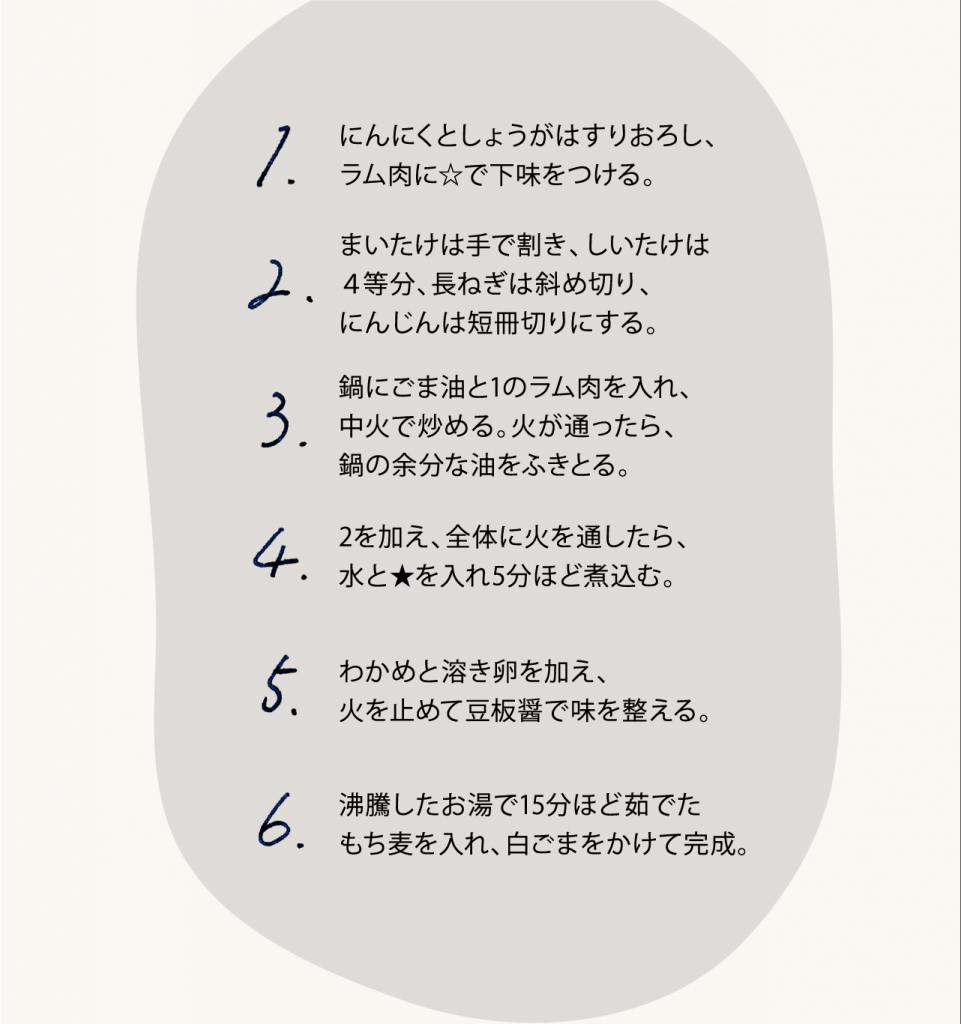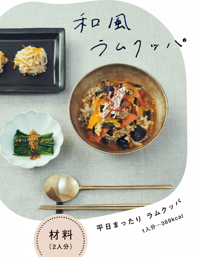 ●低カロリーで食物繊維が豊富なきのこ類、海藻類が具材に。また、もち麦に含まれるβ-グルカンは糖質の吸収を抑える、コレステロールを下げる、腸内環境を整えるというはたらきがあるといわれています。