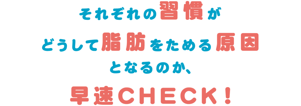 日々の生活の小さな行動の積み重ねが、内臓脂肪の蓄積につながります。自分の生活を振り返ってみましょう。