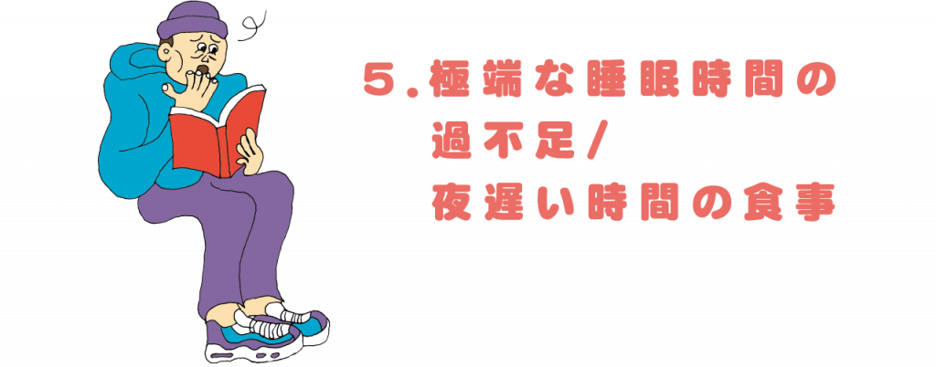 平均睡眠時間が6時間未満もしくは9時間以上の人は、内臓脂肪が多くなる傾向にあります。さらに最近「時間栄養学」という分野の研究で、21時頃になると脂肪をためやすい遺伝子が活発に活動し始めることがわかってきました。そのため同じ内容の食事でも、夜遅くに食事をするとより脂肪がつきやすいのです。
