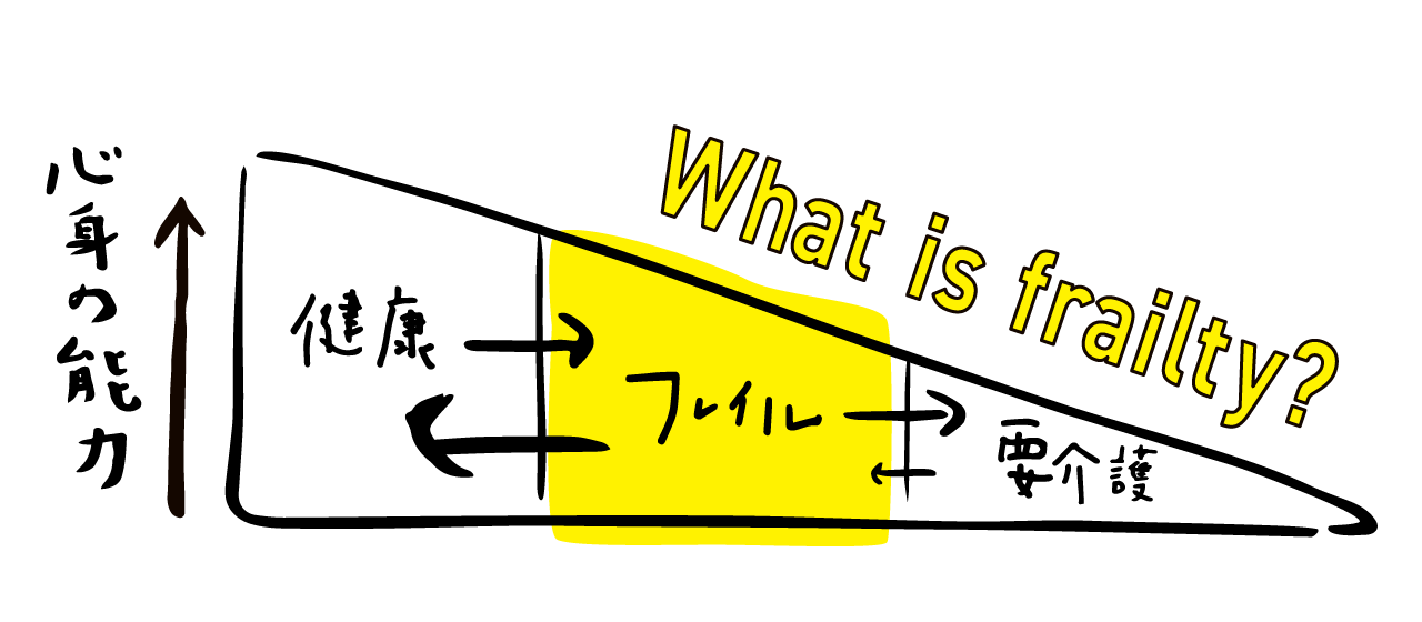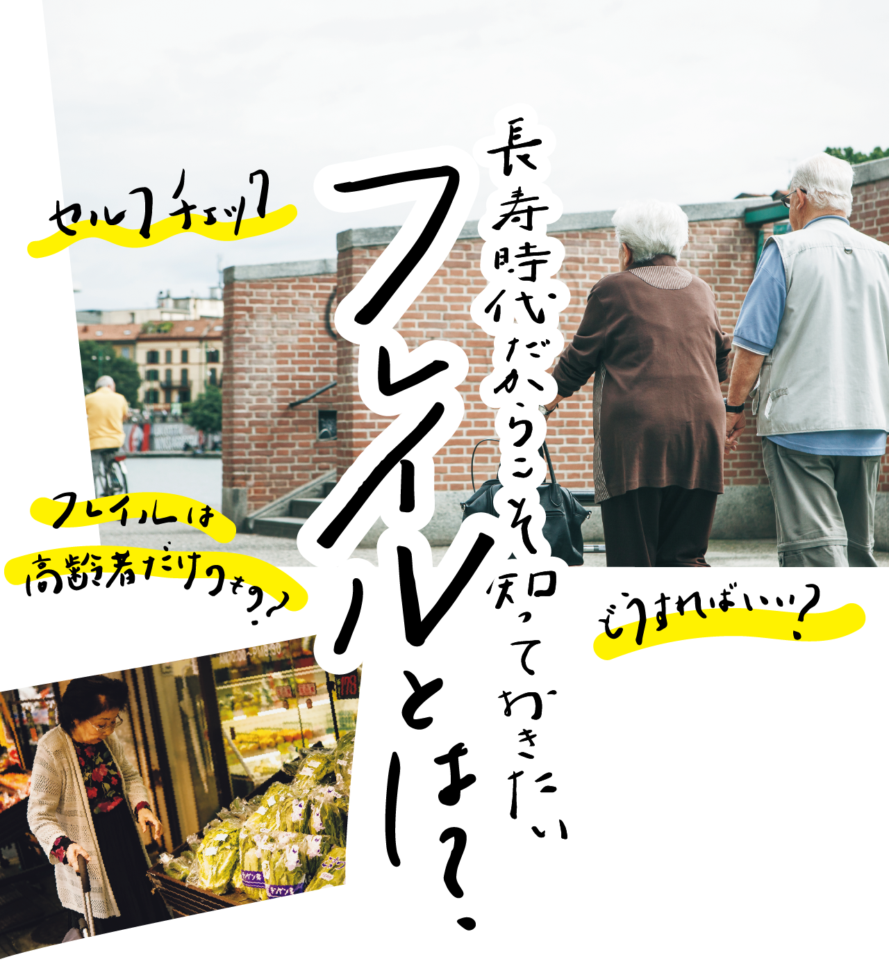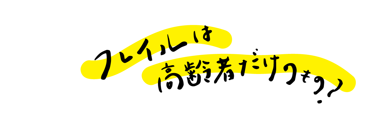 年をとることに伴って、心身が少しずつ弱くなってきた状態のこと。多くの人は、なにかこれといった病気がなくても、年をとるにつれて徐々に心身に衰えが生じますが、フレイルやその前段階で小さな衰えに気づき、早めに適切な対策をとることで、より簡単に元気な状態に戻れたり、健康で自立した生活を長く保っていくことができます。