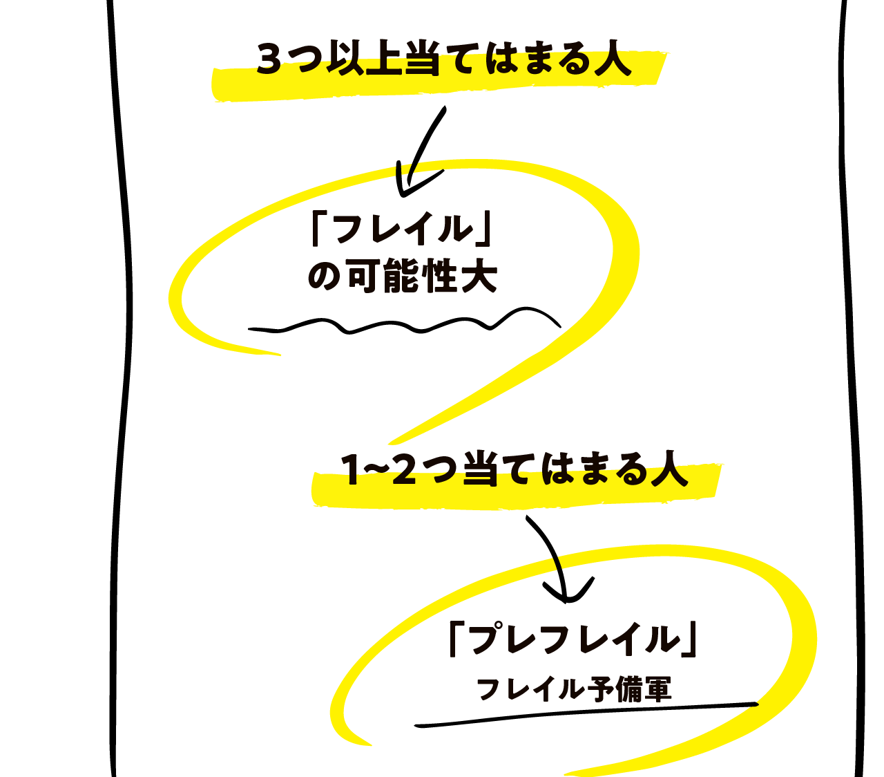 フレイルの対象となるのは主に高齢者(特に後期高齢者)ですが、身体的な衰えはより若いうちから徐々に始まっているもの。40歳でも50歳でも、下の「フレイルセルフチェック」に当てはまるものがある人は、フレイル対策を始めるのがお勧めです。
