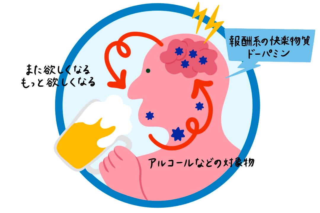 アルコールや薬物は、体内に摂取するだけで報酬系を刺激する手軽さがあり、くり返し摂取することで、頭ではやめたい・やめたほうがいいと思っていても、それらを欲するようになります。また、ギャンブルやゲームで勝つか負けるかのスリルを感じることなども、報酬系を刺激します。