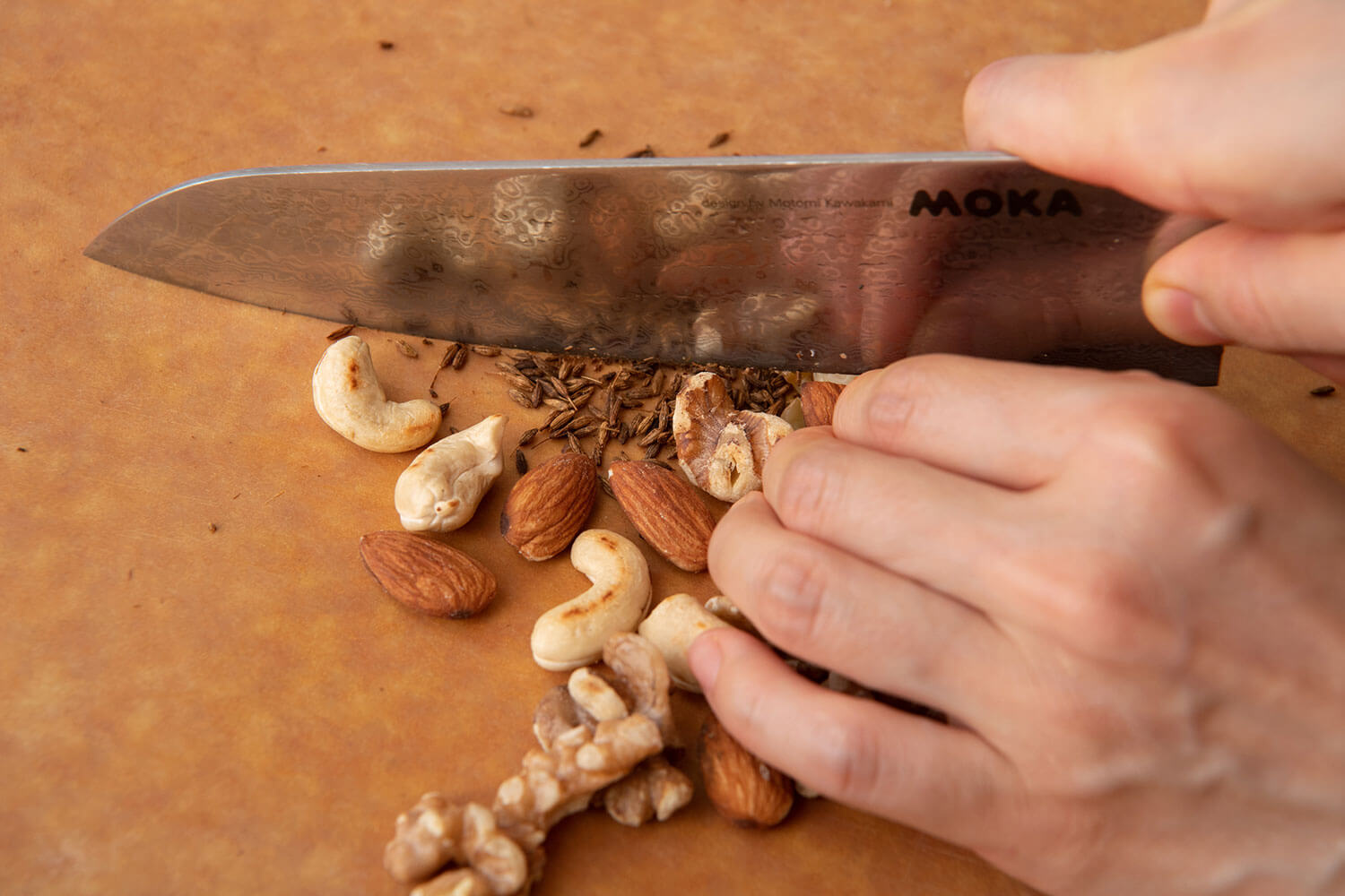 1.ミックスナッツとクミンシードを乾煎りします。ナッツが軽く色づき、クミンシードの香りが立ってきたら火からおろして、よく冷ましたあと、包丁で粗く刻みます。