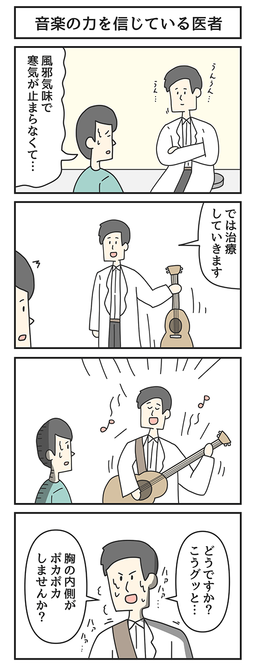 読むと思わずクスっと笑ってしまう作風で、SNSを中心に絶大な人気を誇る漫画家・ジョンソンともゆきさん。そんなジョンソンともゆきさんが描く、「健康」をテーマにした4コマ漫画の連載企画! 第14回は、「音楽の力を信じている医者」「やってはない」の2作品です。仕事や私生活で疲れがたまっているあなたに、ふっと肩の力が抜けるひとときをお届けします。