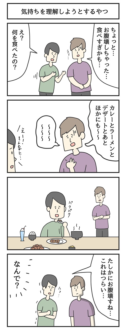 読むと思わずクスっと笑ってしまう作風で、SNSを中心に絶大な人気を誇る漫画家・ジョンソンともゆきさん。そんなジョンソンともゆきさんが描く、「健康」をテーマにした4コマ漫画の連載企画! 第16回は、「気持ちを理解しようとするやつ」「伝える力」の2作品です。仕事や私生活で疲れがたまっているあなたに、ふっと肩の力が抜けるひとときをお届けします。